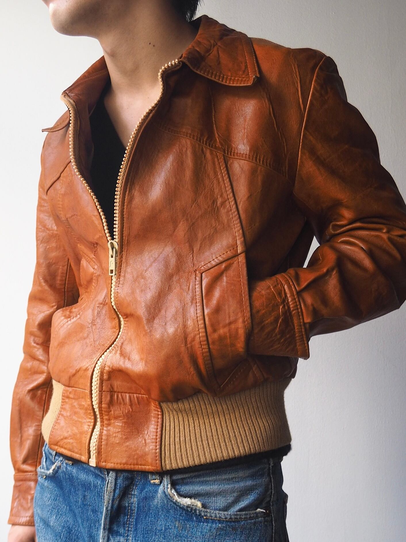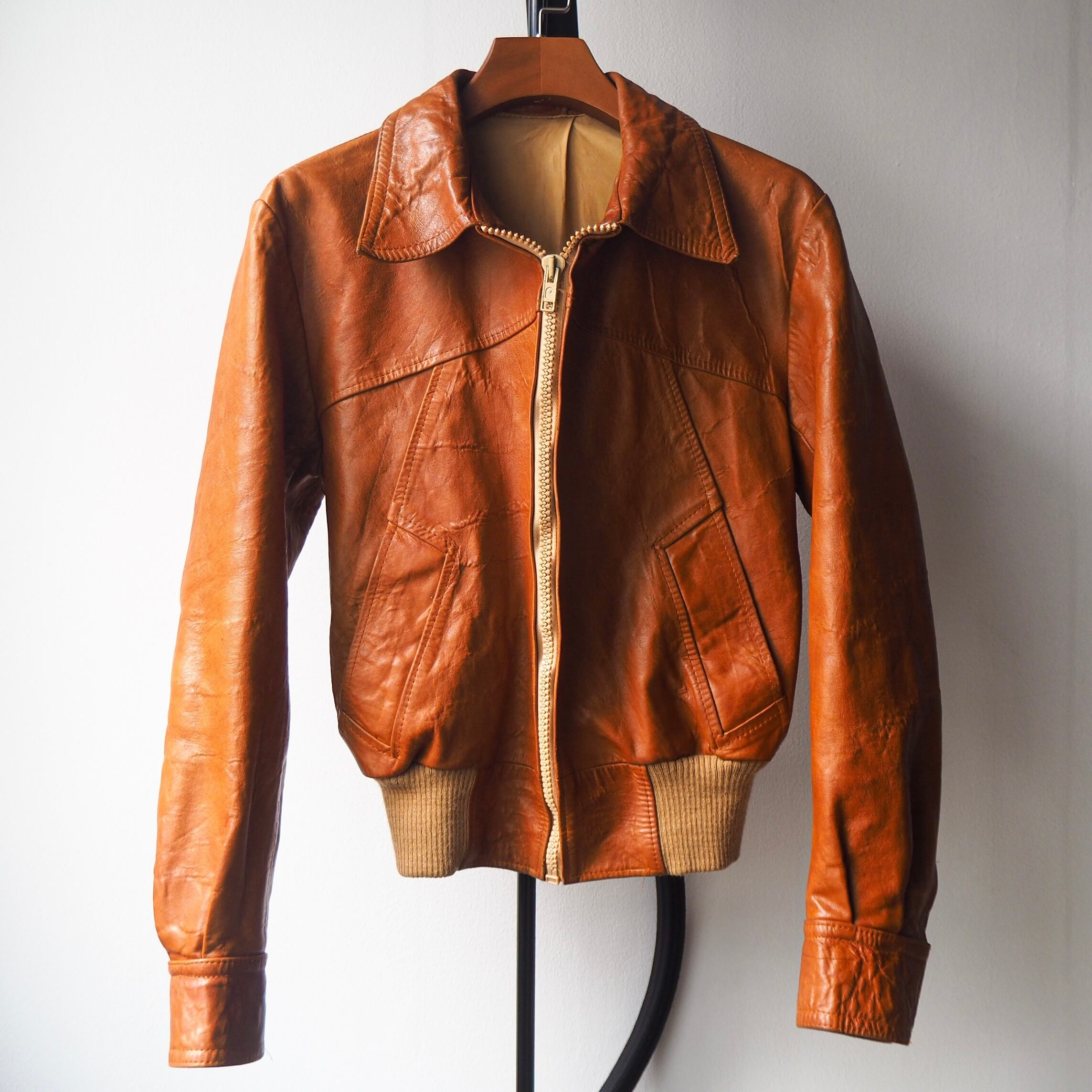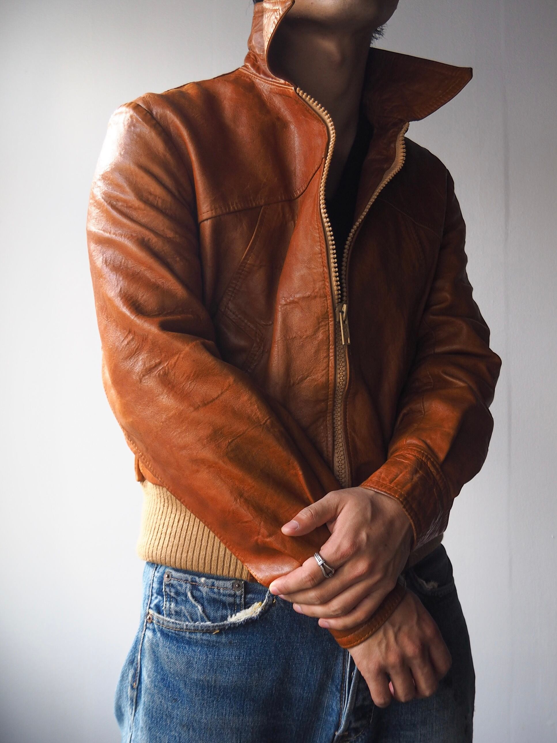 キャメルカラーのパリッと艶やかなレザー生地に、シャープな着丈から構成されるコンパクトなデザイン設計。前振りの良い立体的なアーム周りに、当時の時代感が窺える先端の尖ったカタチの良い大きな襟元。