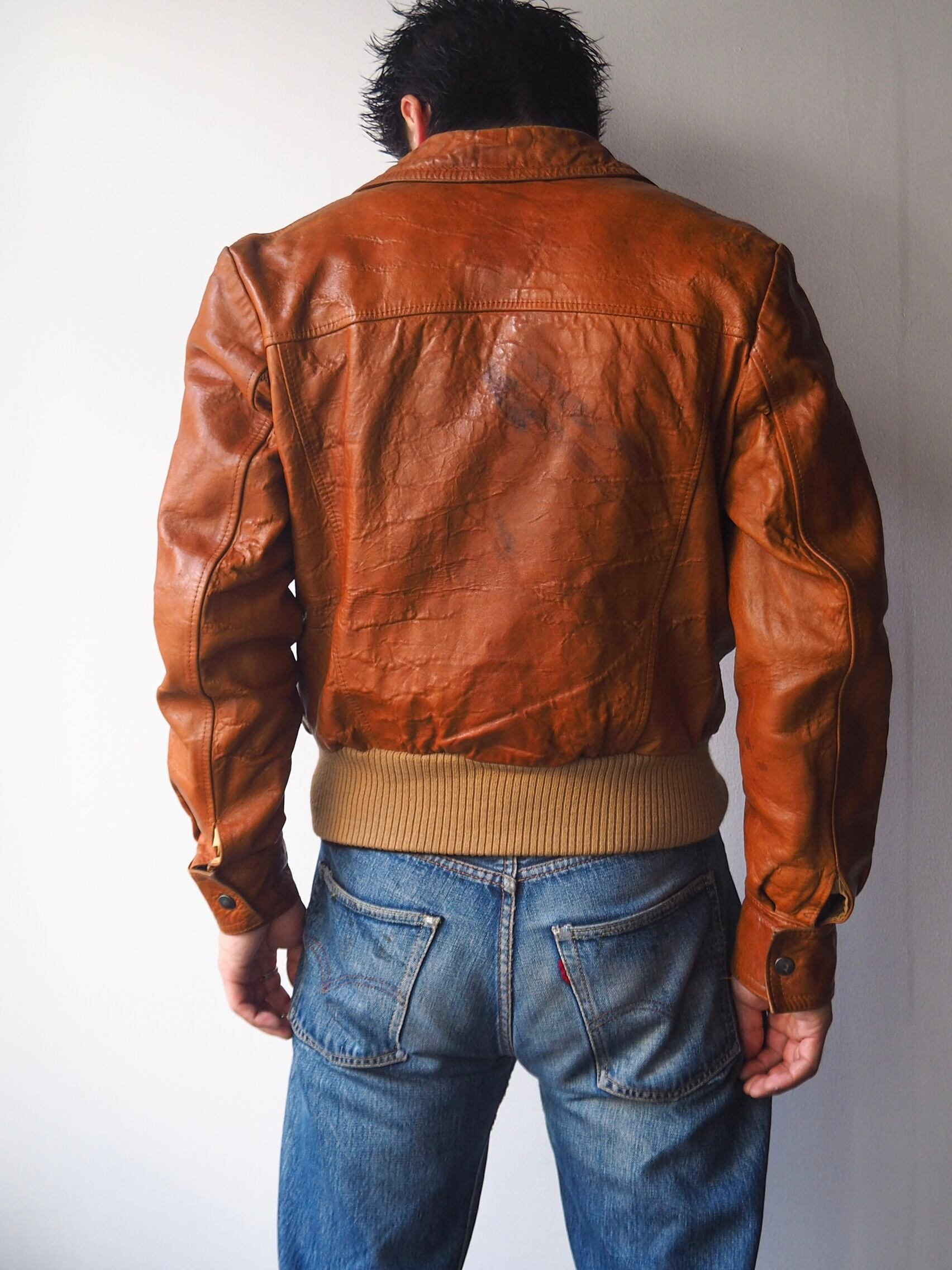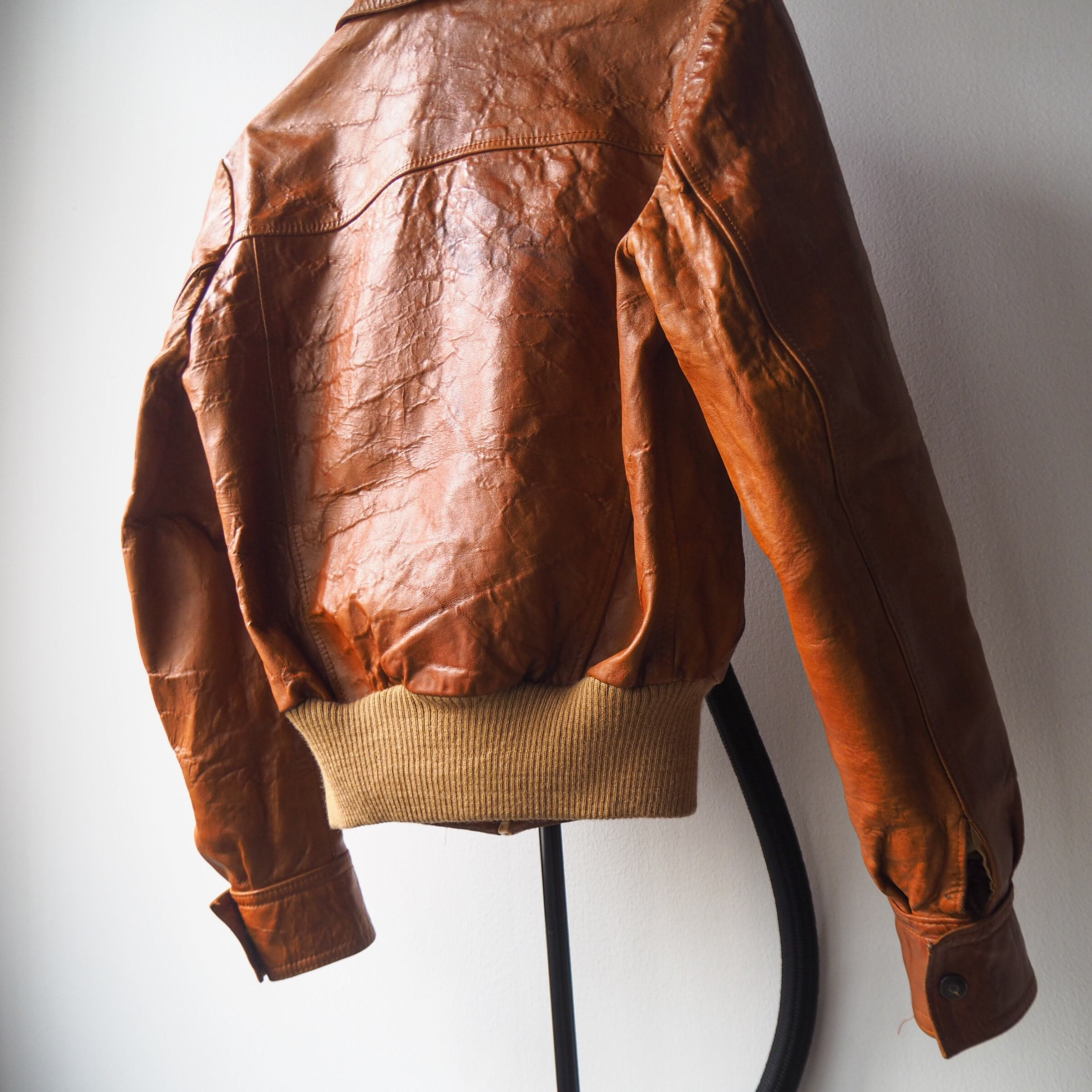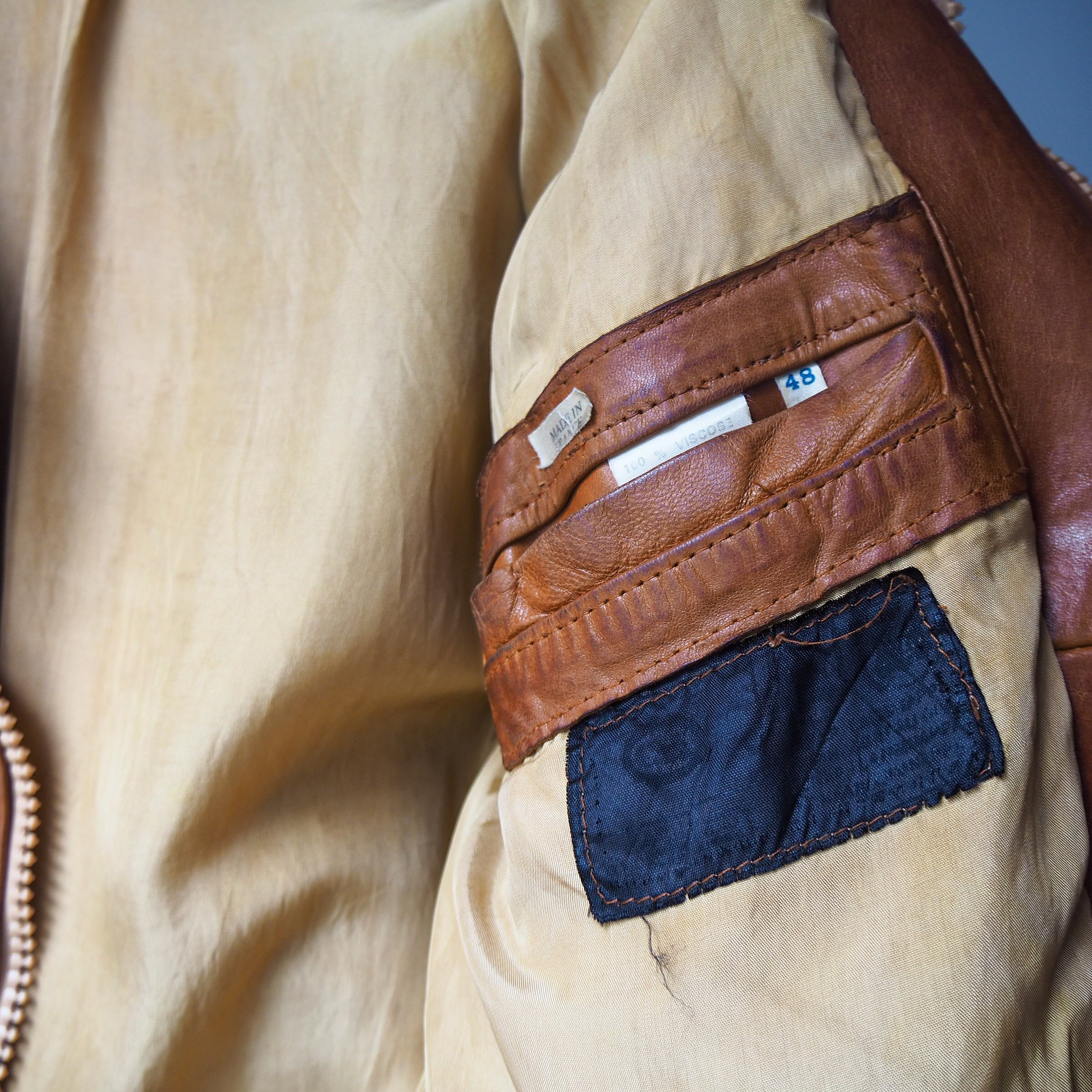 キャメルカラーのパリッと艶やかなレザー生地に、シャープな着丈から構成されるコンパクトなデザイン設計。前振りの良い立体的なアーム周りに、当時の時代感が窺える先端の尖ったカタチの良い大きな襟元。