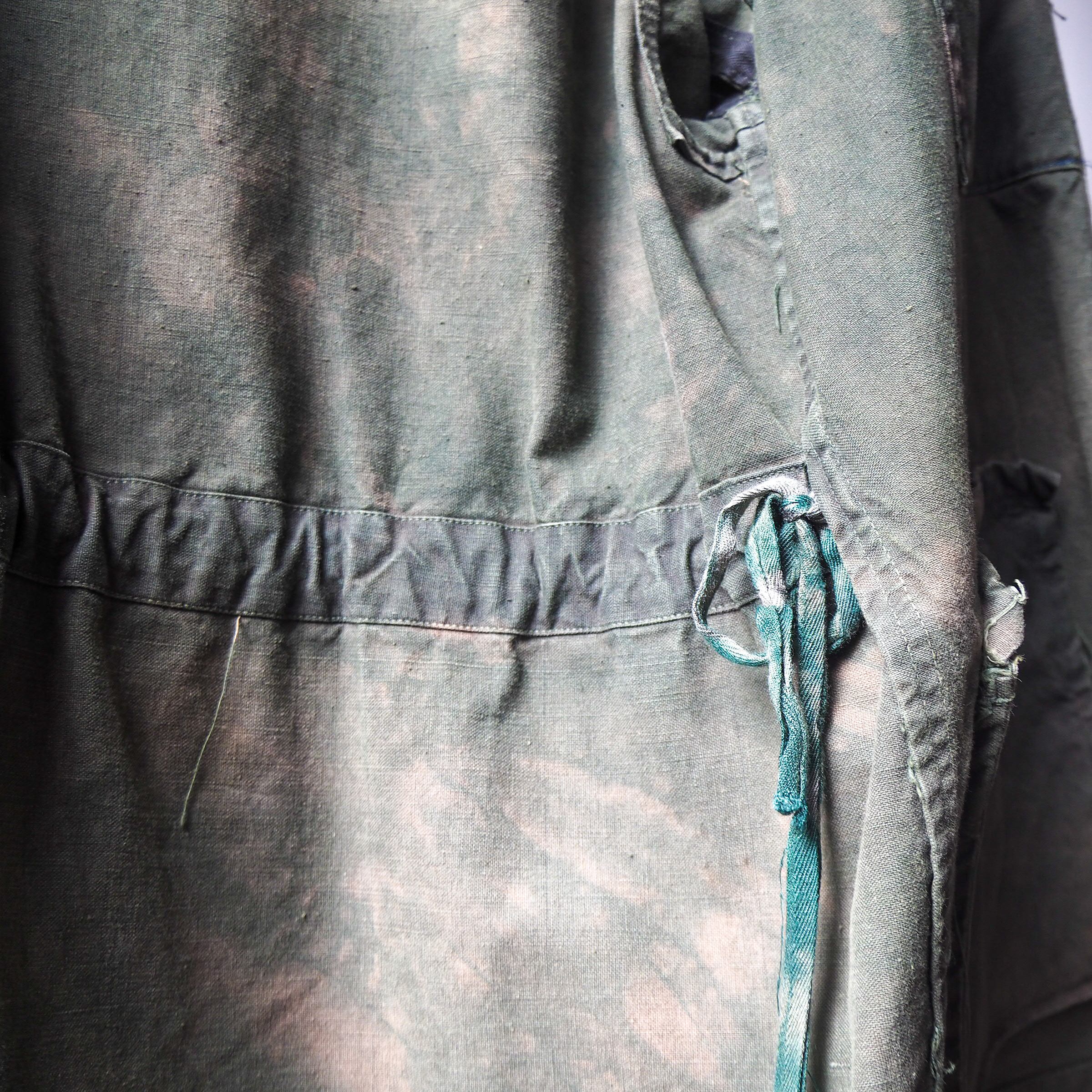 ボディはガシッと目の詰まったコットンキャンバス生地。上から施されたまだらな迷彩模様は戦地で泥やすり潰した木の実などの天然の素材を用いて行われたものでしょう。