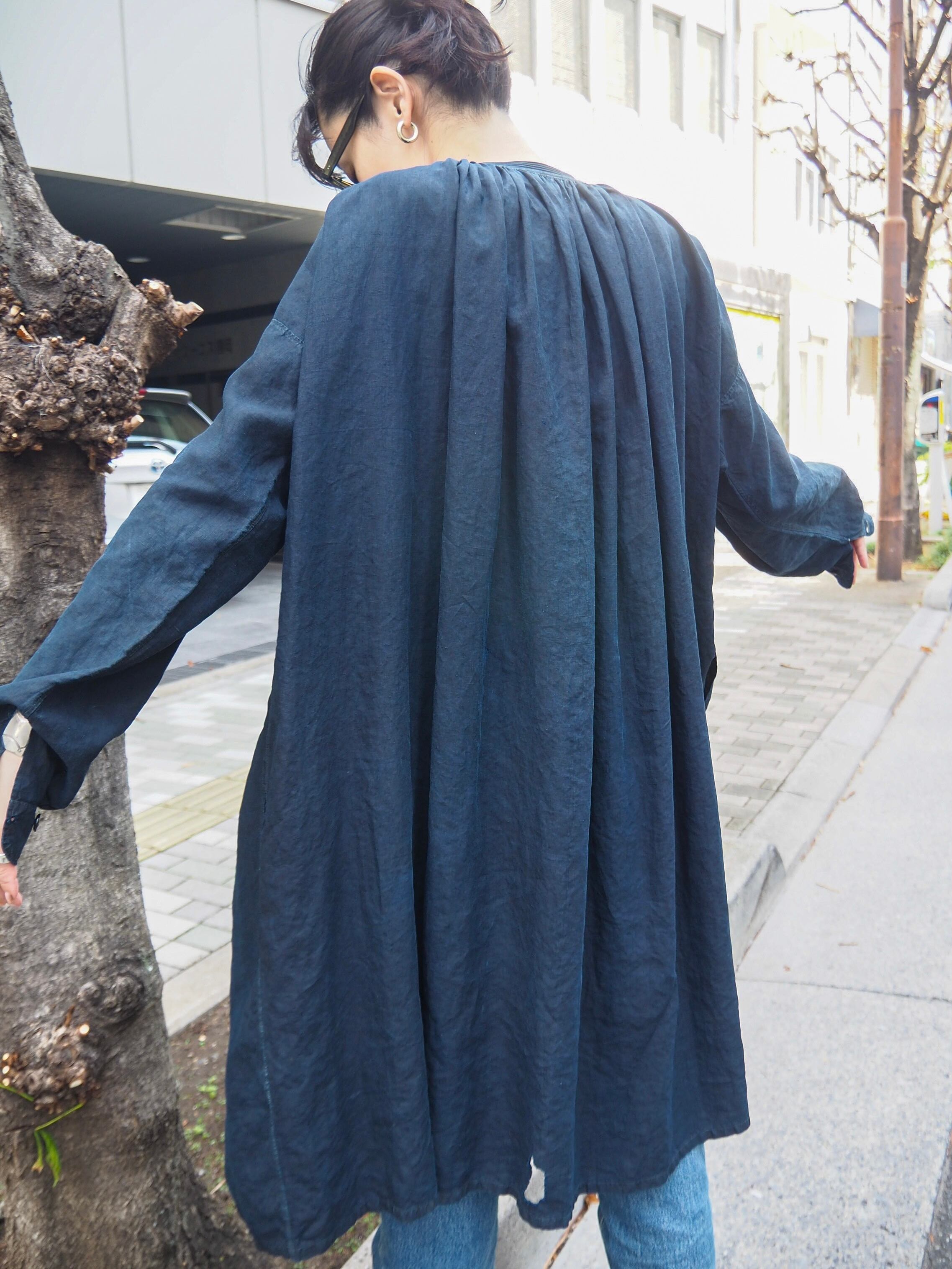 一つ一つ手作業で寄せられた首周り、手首の細かなギャザーは身体の動きによって広がるよう設計された純然たるワークウェアとしての設計。
