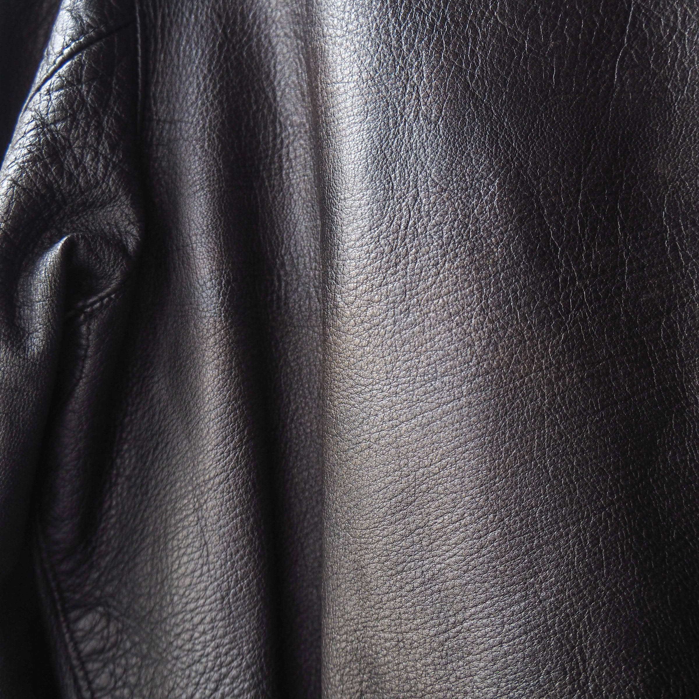 パイロットジャケットと言えどそのクオリティは千差万別ですがこちらはシボの効いたソフトな質感に滑らかな光沢が光るとても良いレザー生地。
