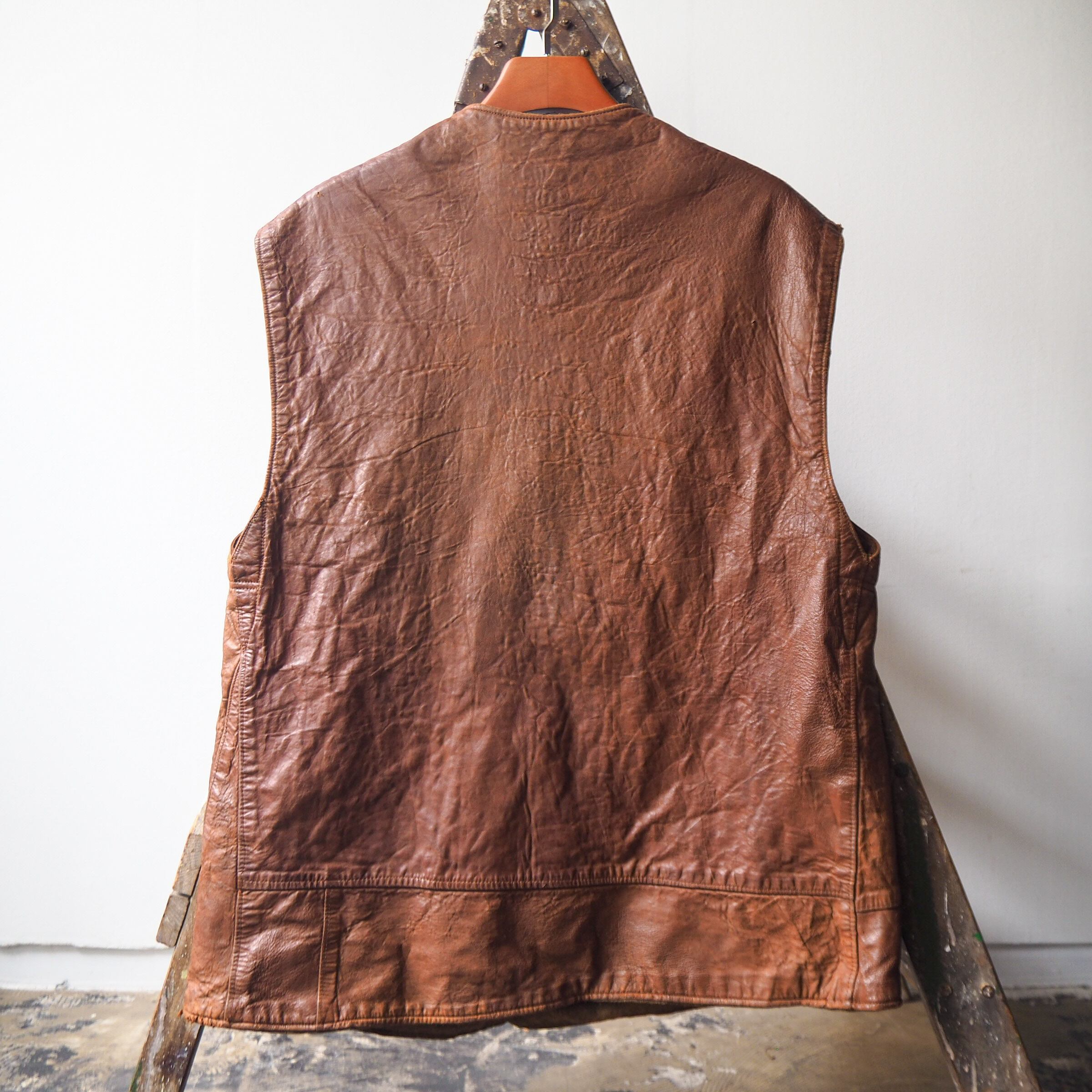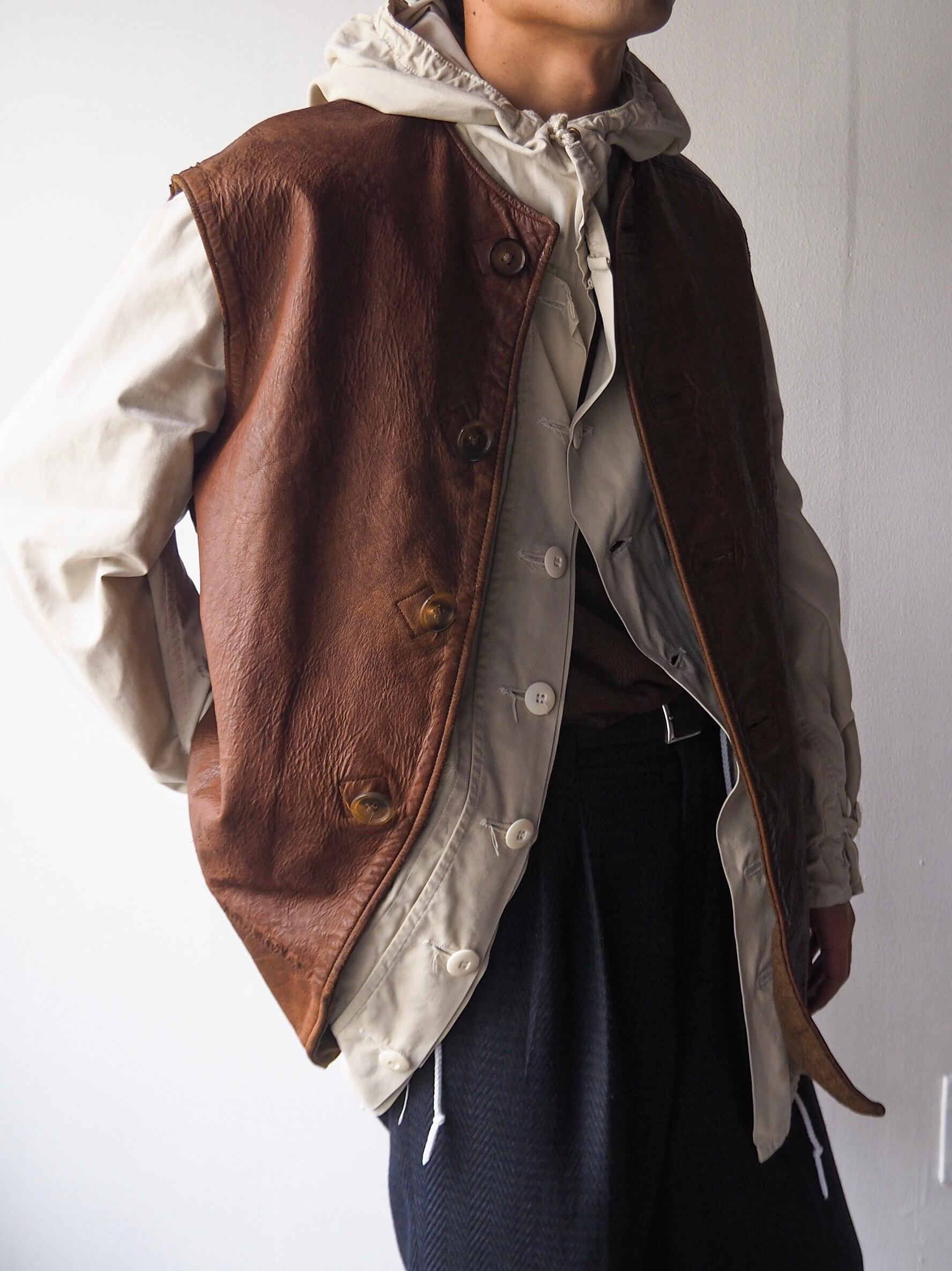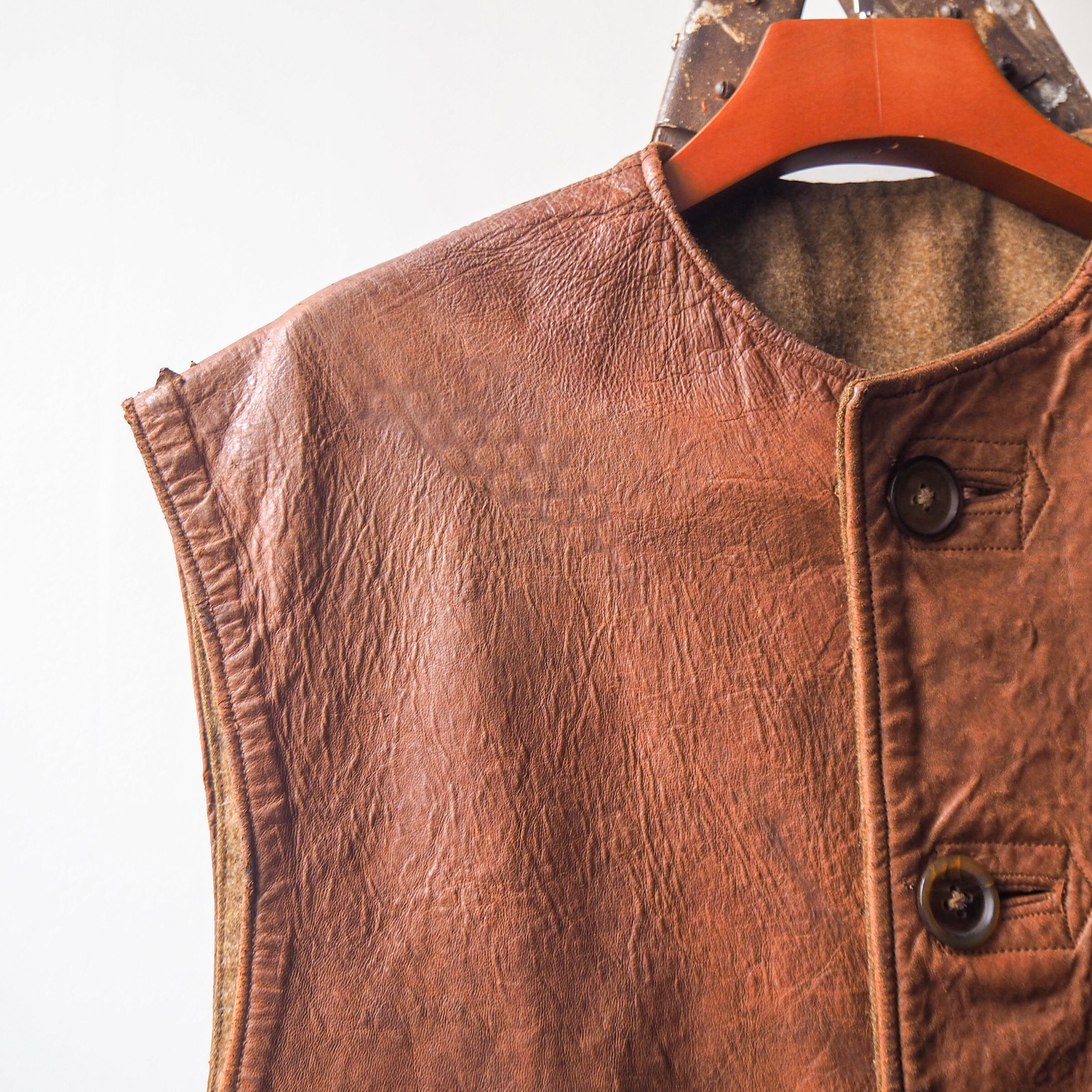 当時の物資不足の兼ね合いもあり、各工場の端材を用いて製造されることの多かったジャーキンレザーベスト。個体によって異なる「継ぎ」のある表情がラギッドでとても格好良い。