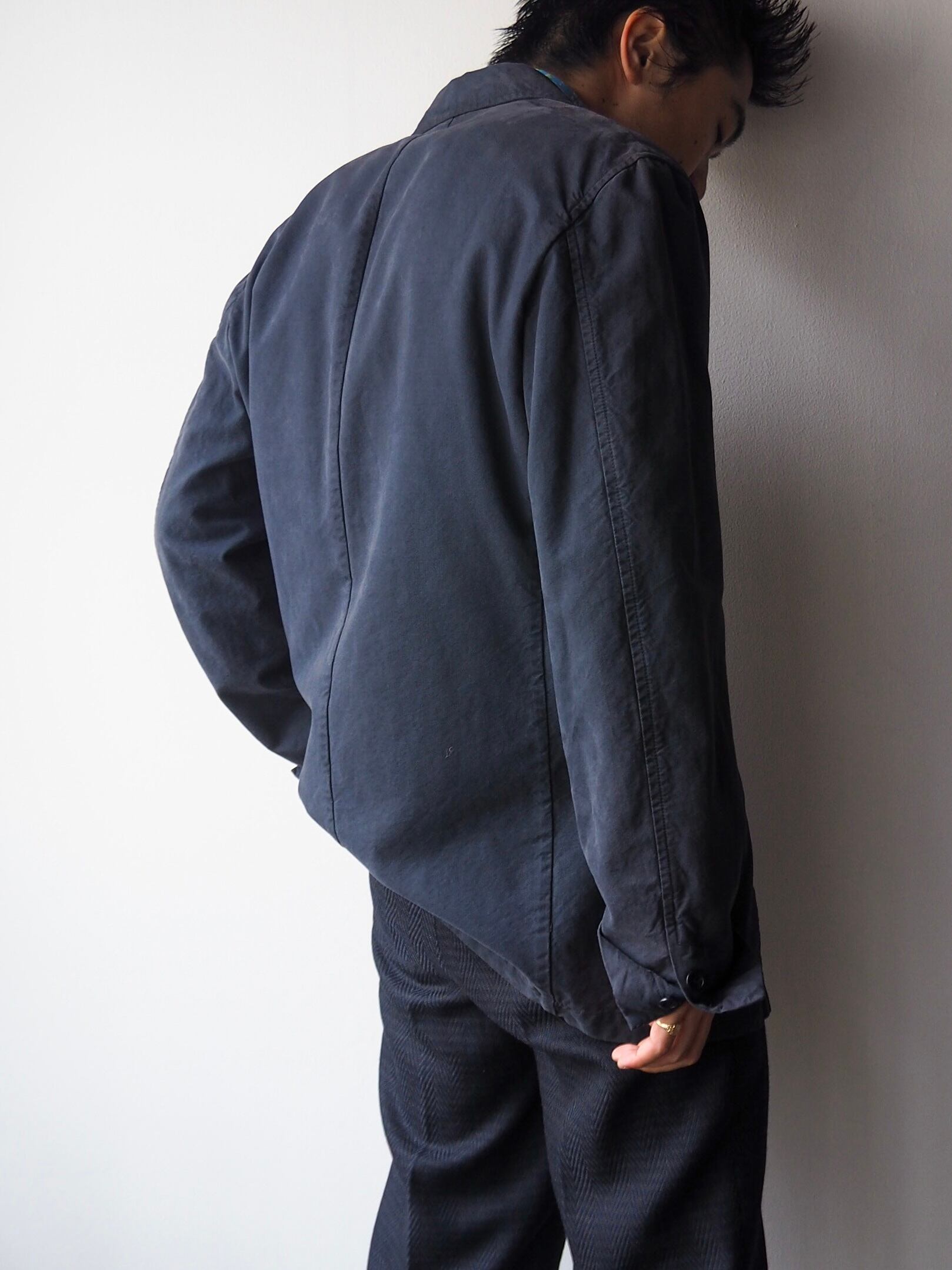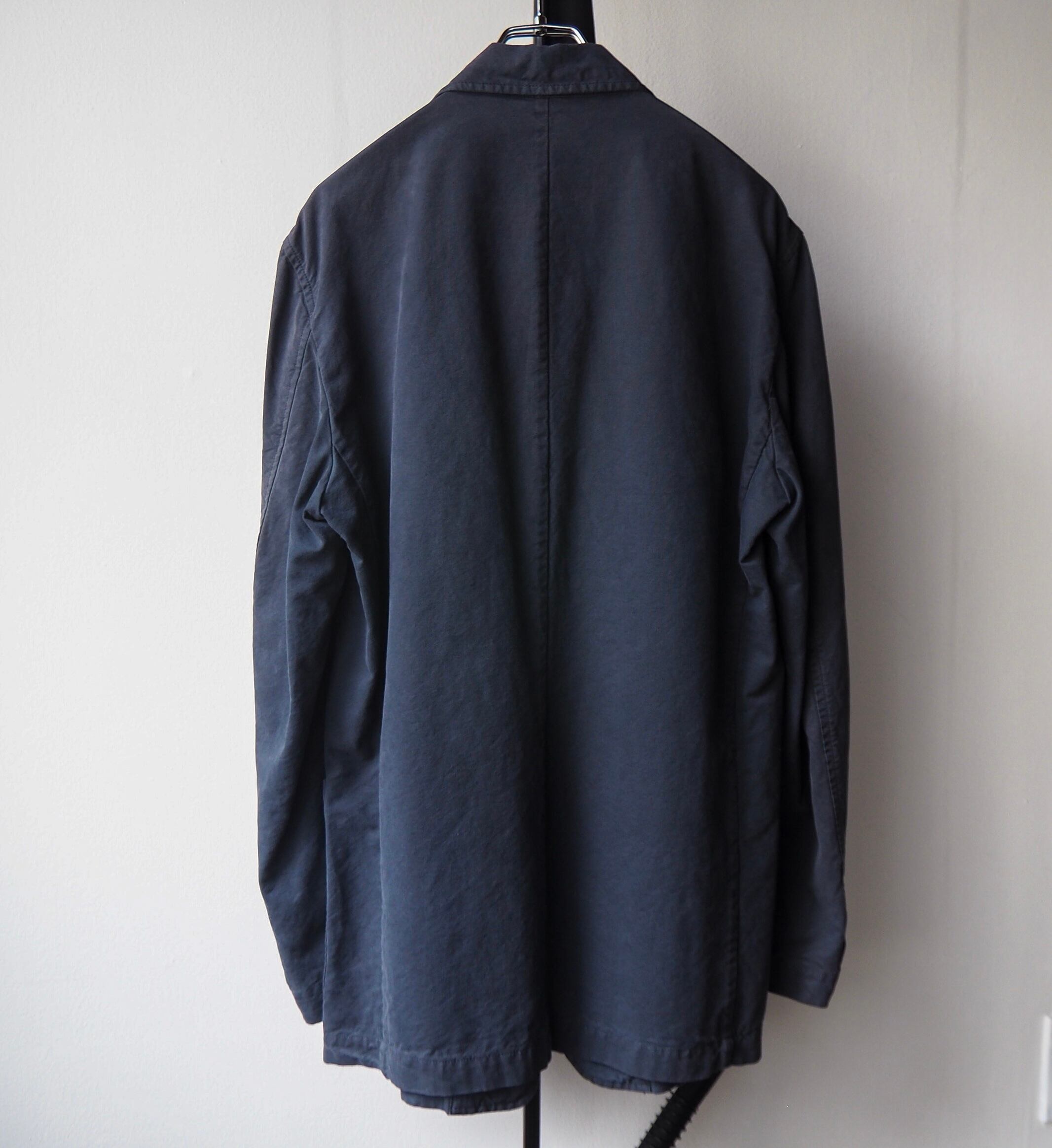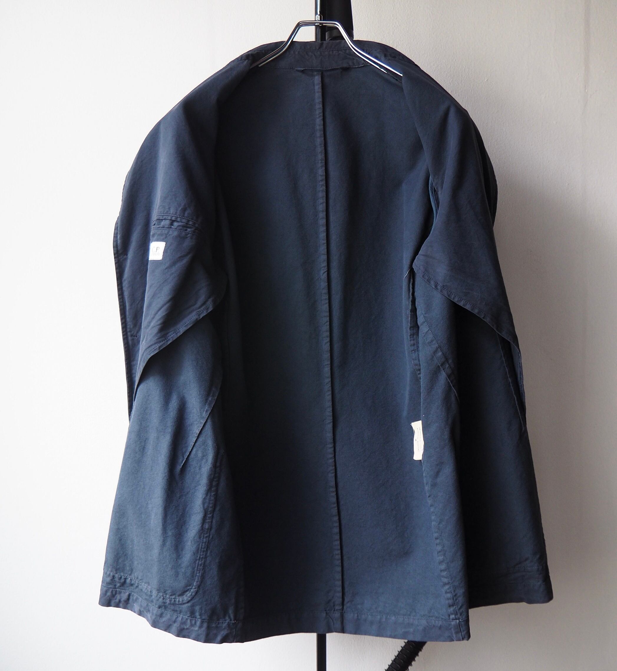 ボディは縫製後、製品染めが行われたガーメント・ダイドコットン。肩パッドや裏地が付属しないアンコン(Unconstructed)仕様のエレガンスでありながらも非常に軽やかでソフトな設計。