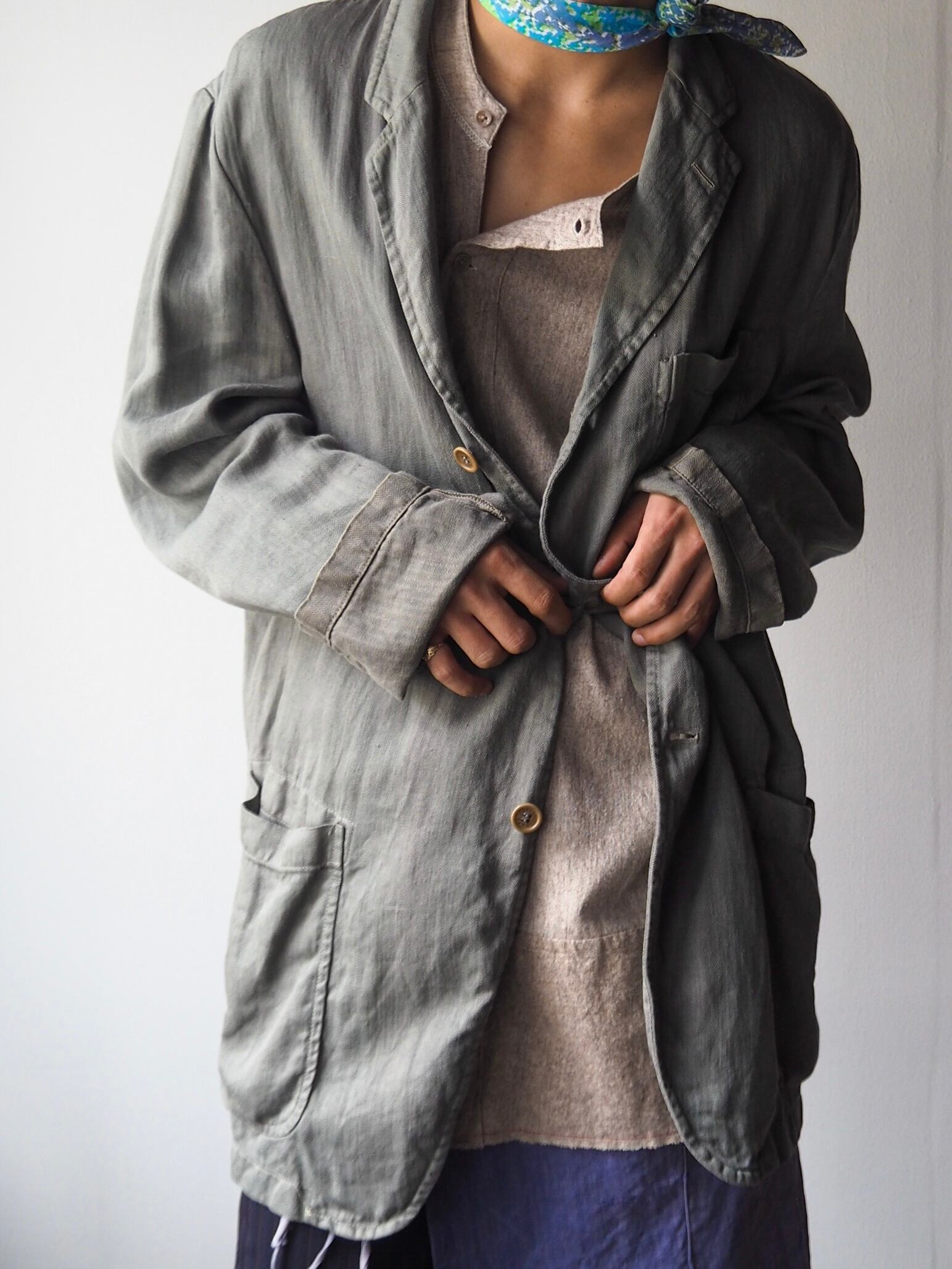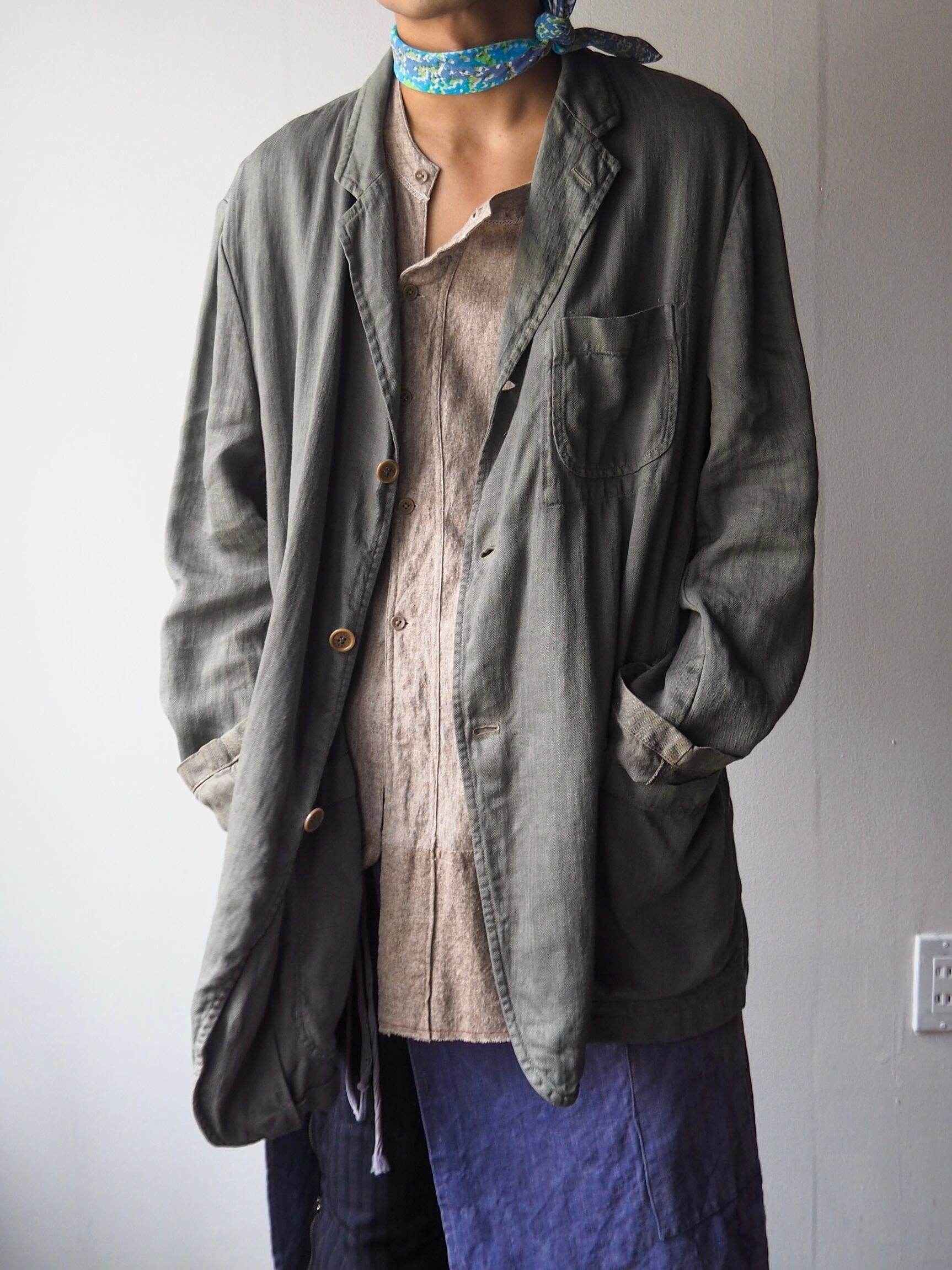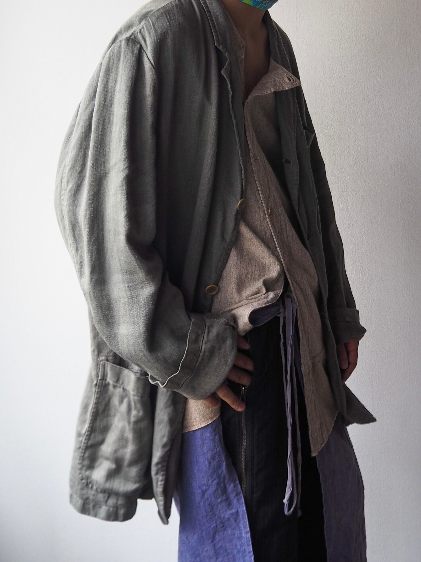とにかく生地の落ち感、リネン素材のドレーピーな影のある表情がとても格好良いのでザクっとオーバーにだらりと羽織ってあげて下さい。