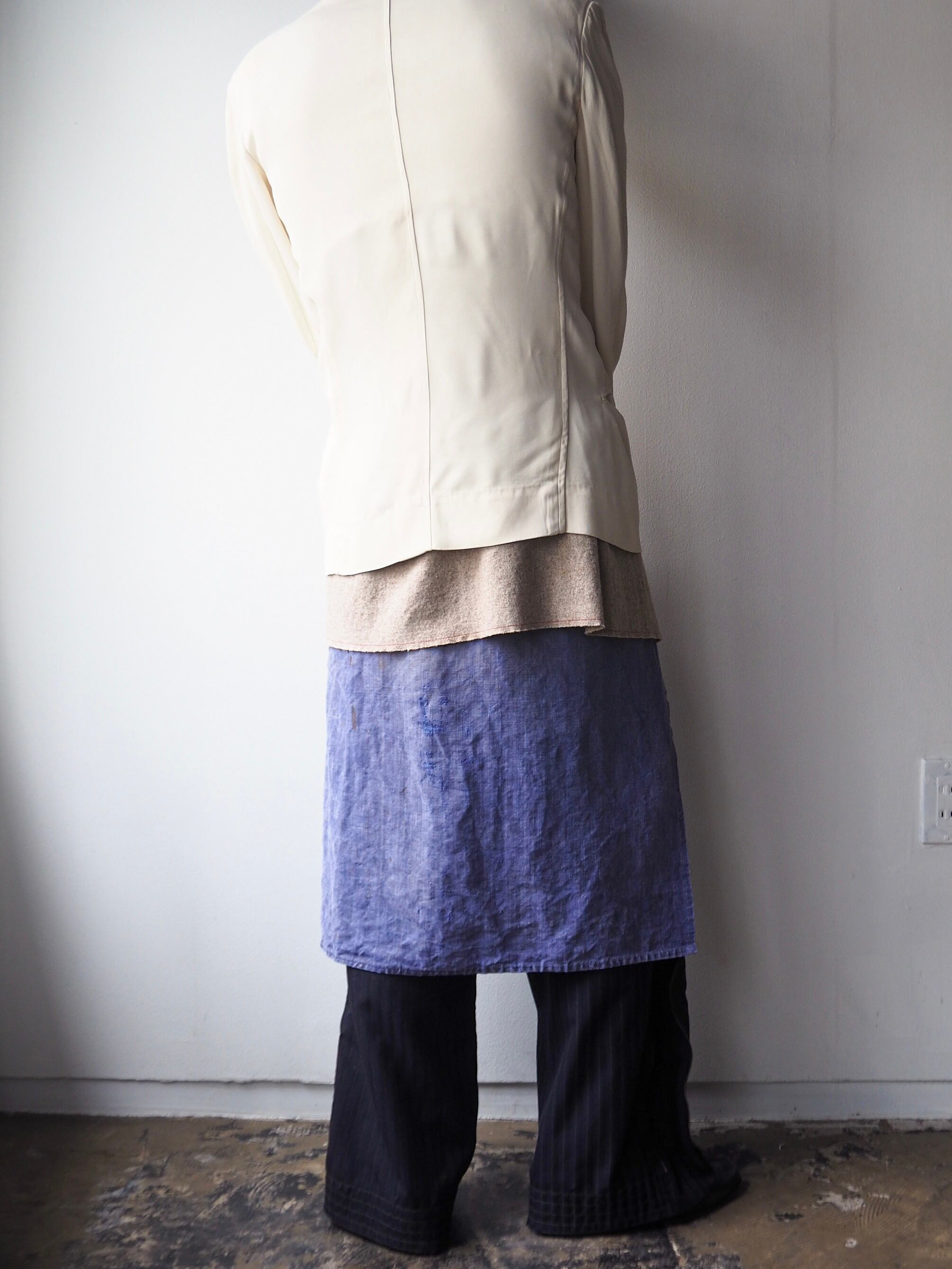 フロントのダーツ、背面脇の切り返しによって絞られたウエストのシェイプ。古い年代のものらしく脇は高めに、左右ポケットは後方に巻かれています。