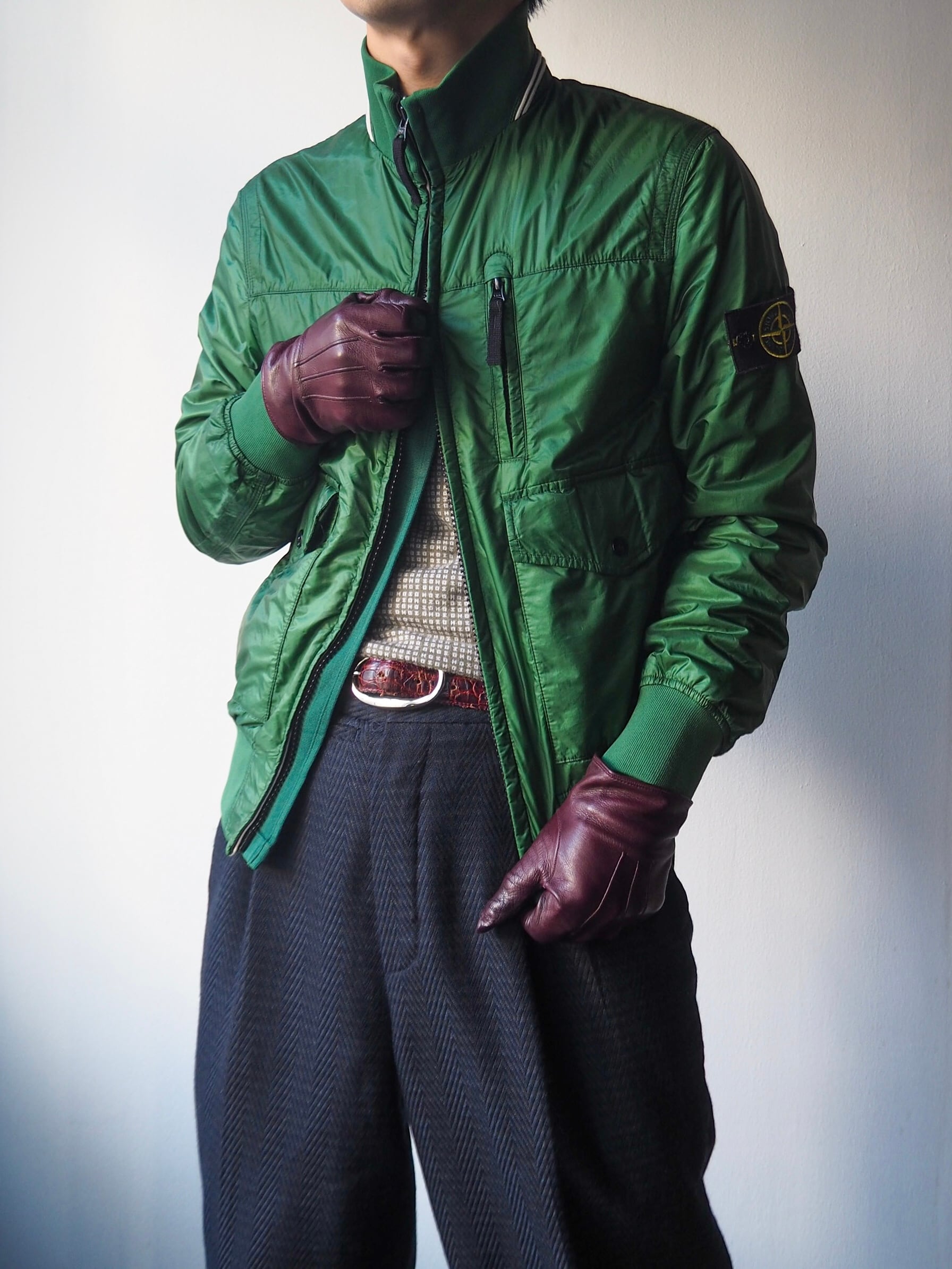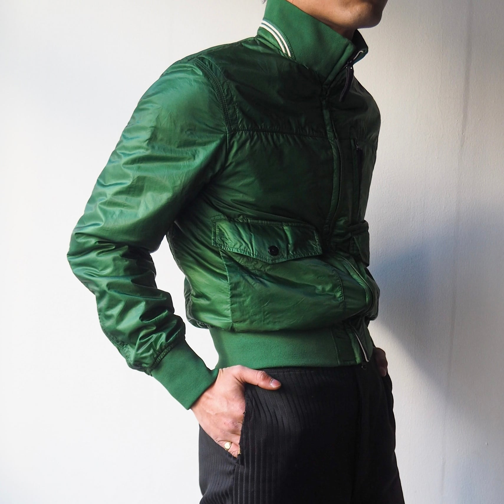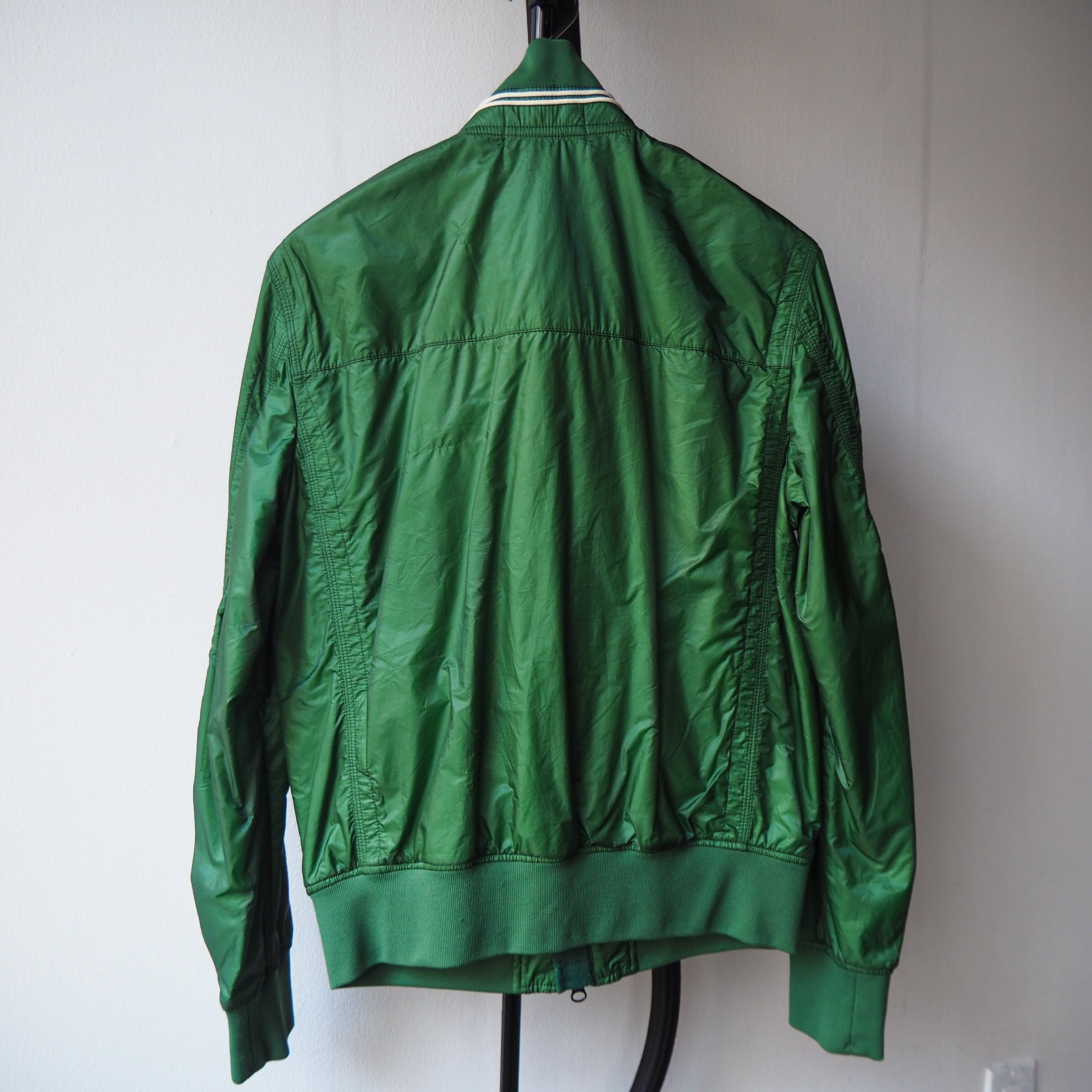 鮮やかではありますが、悪目立ちすることのない上品なグリーンですのでトラックジャケット感覚で気負わず着用して頂けるかと思います。