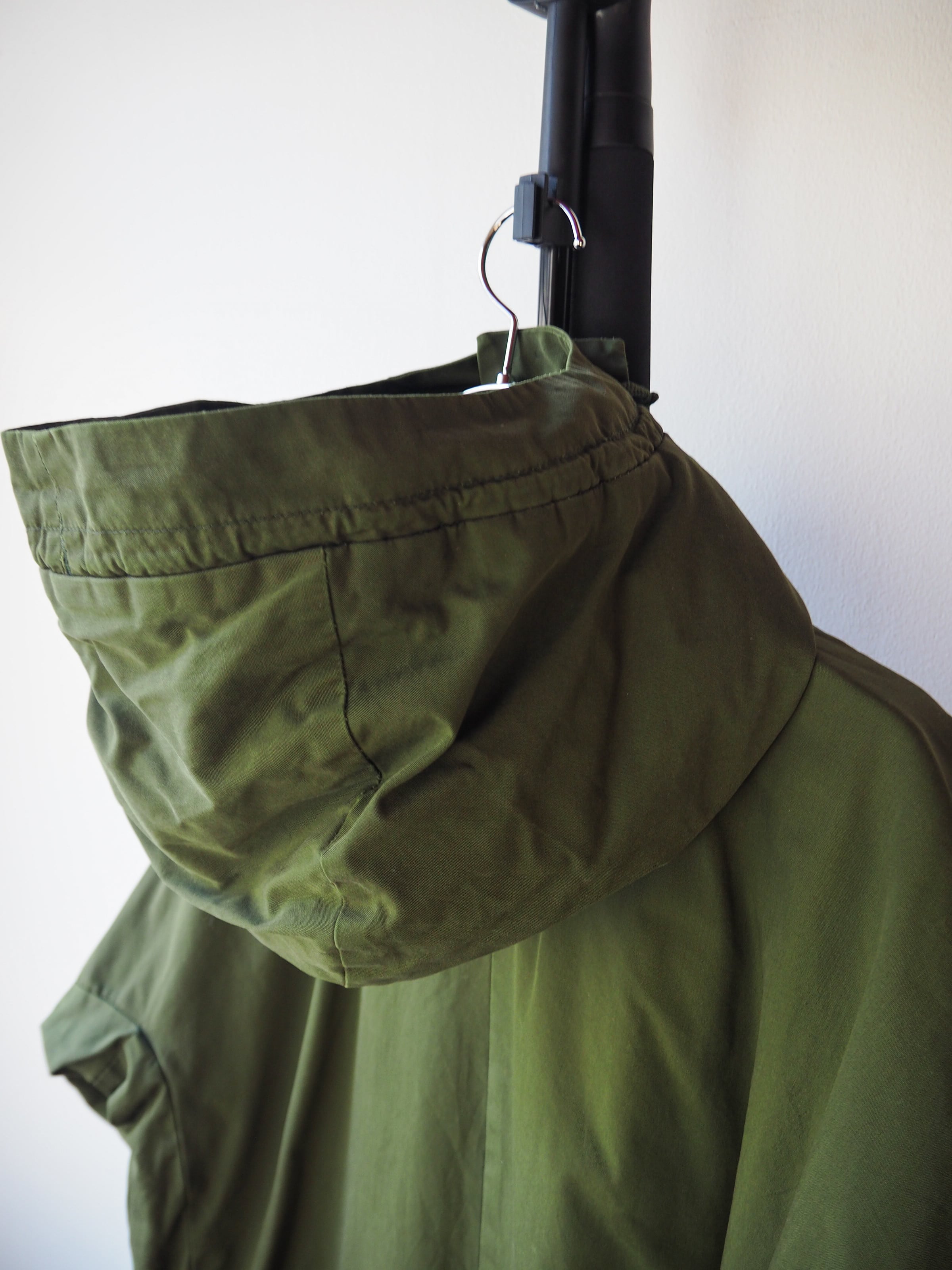 多くの装備を身に着けながら快適に動けるようにと広目に取られた身幅と、一枚袖仕様のなだらか落ちる肩周りが生み出す秀逸なAラインシルエット。