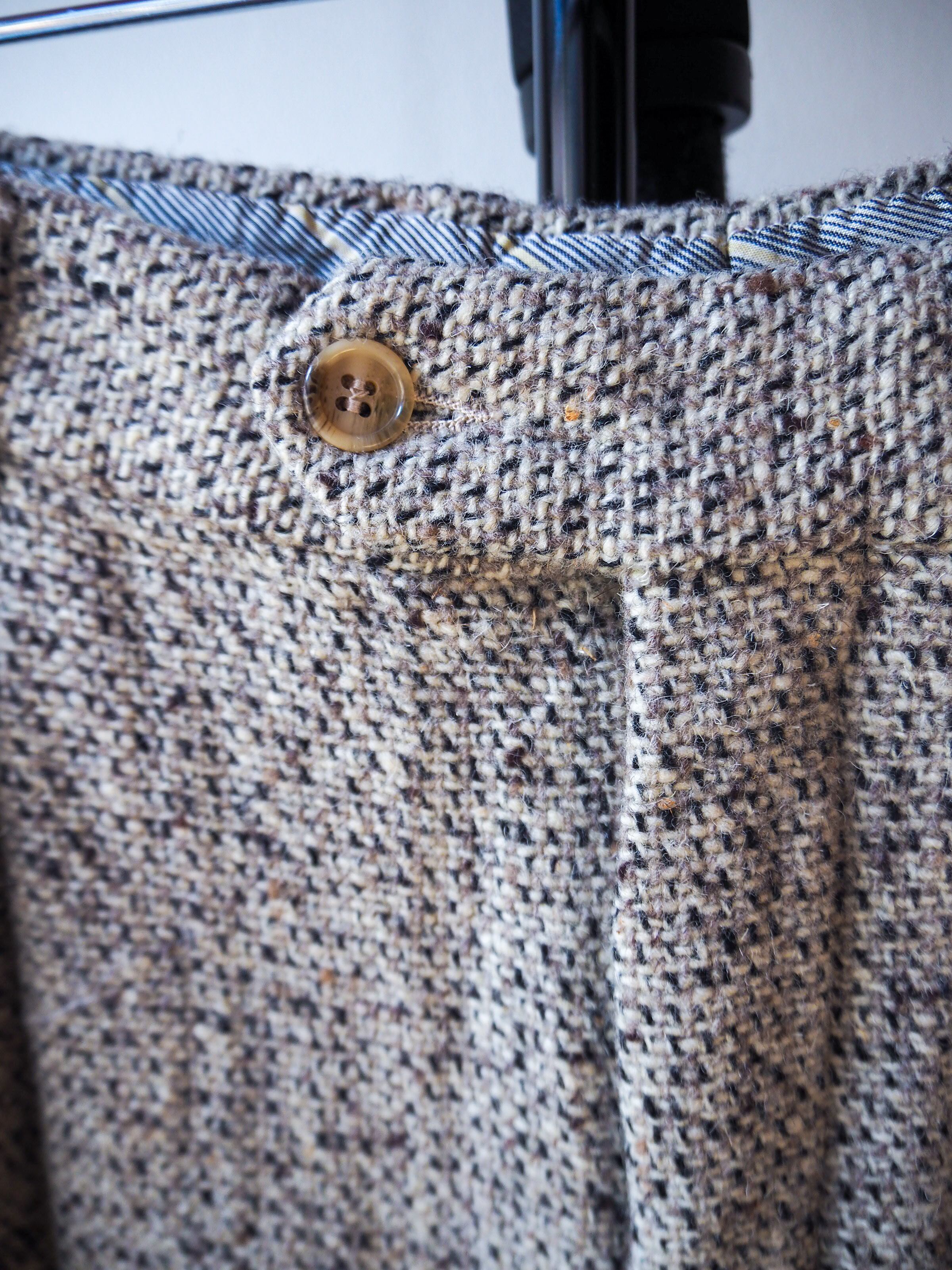 生後一年以内の羊の毛を刈り取った"Pure New Wool"を使用した肉厚でありながらもソフトな生地感。白をベースに黒をクロスし、ときどき黄を織り込むことで色味のバランスがとられたイタリアらしいとても良い生地です。