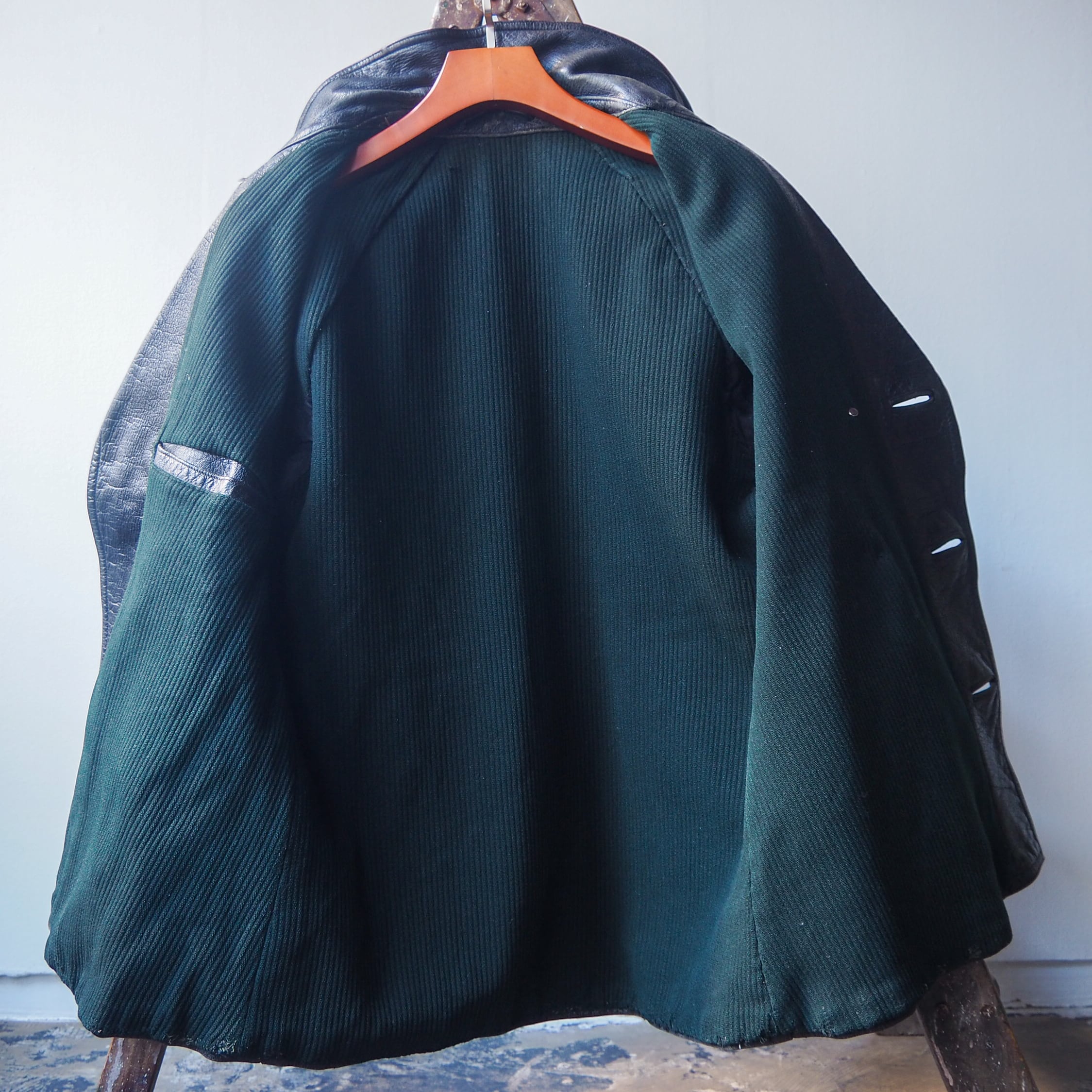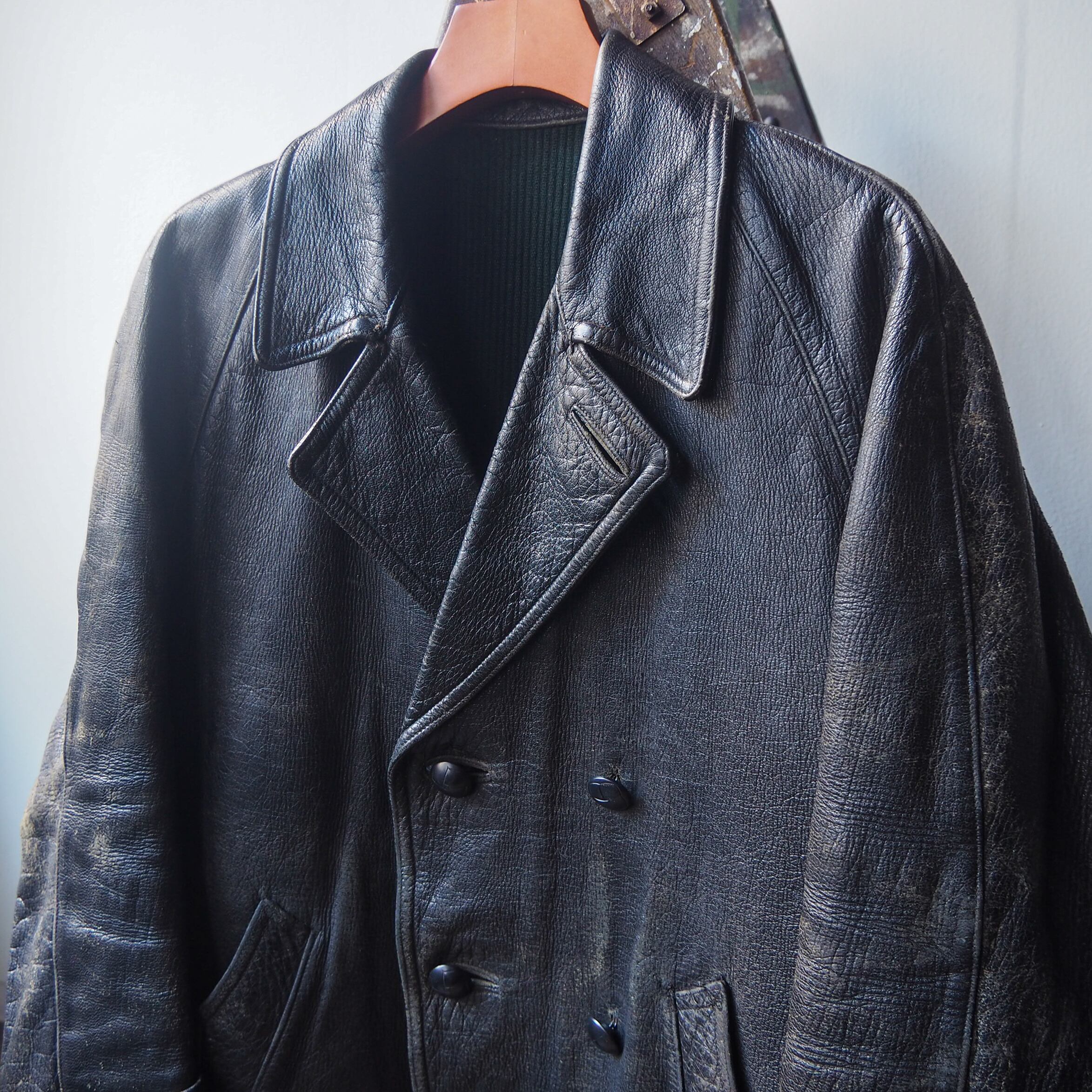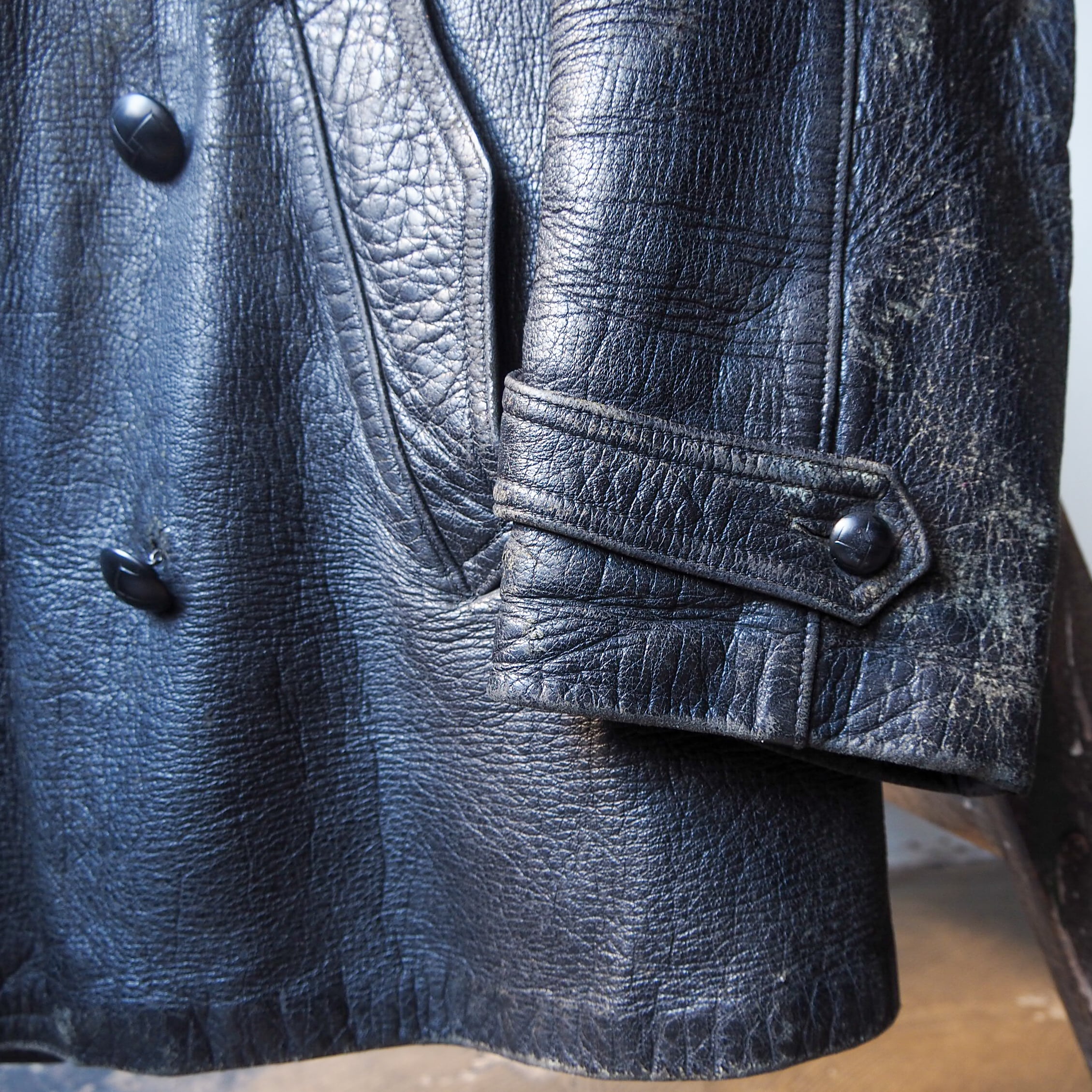 製造から70余年の歳月を経た現在でもなお鈍く鋭い光沢を発するキメの細かい上質なゴートスキン。形の良い襟が特徴的なパターンメイキング。機動力を損ねないラグラン仕様の肩周りなど、カーコートという用途に沿った上でのこだわり抜かれたディティールの数々が見られます。