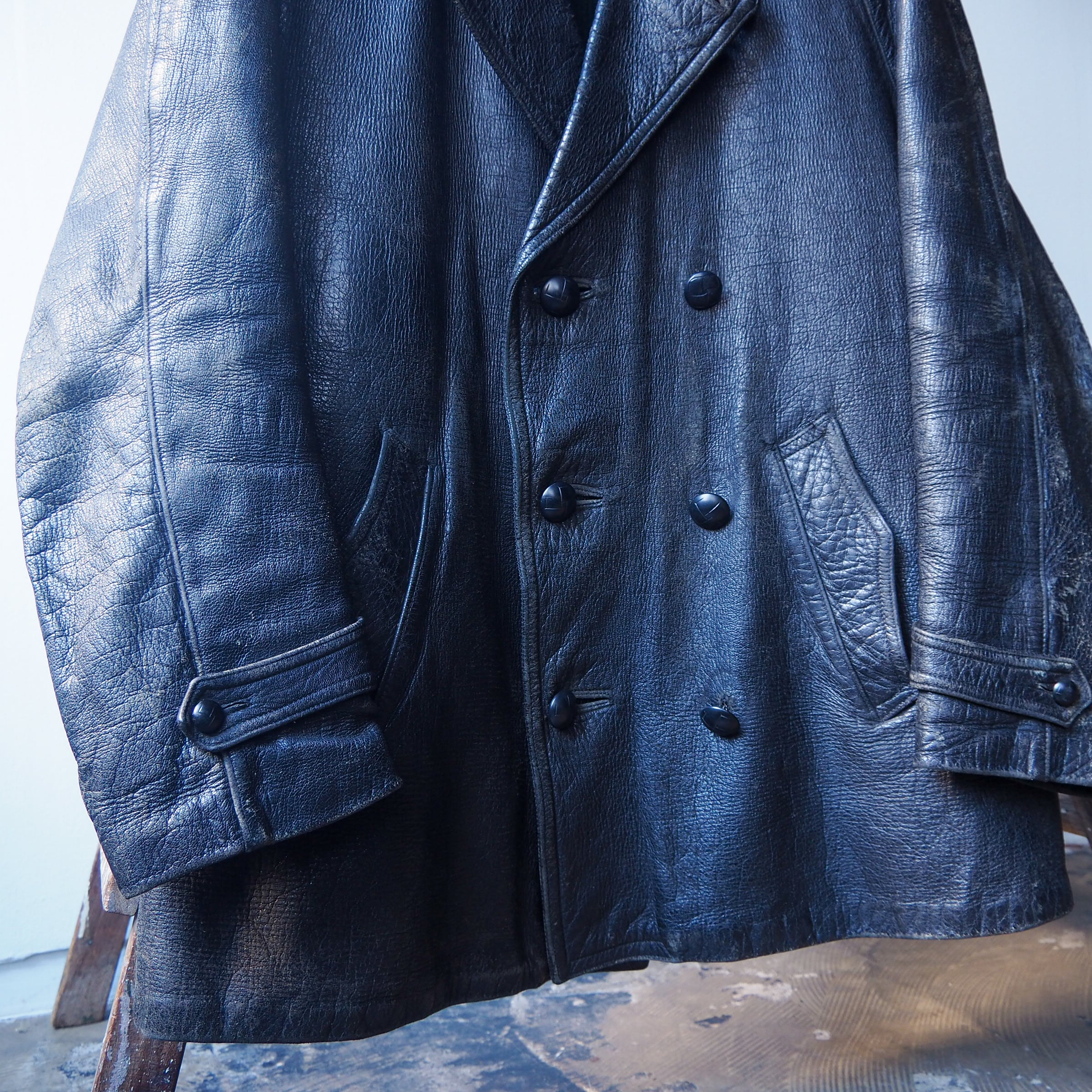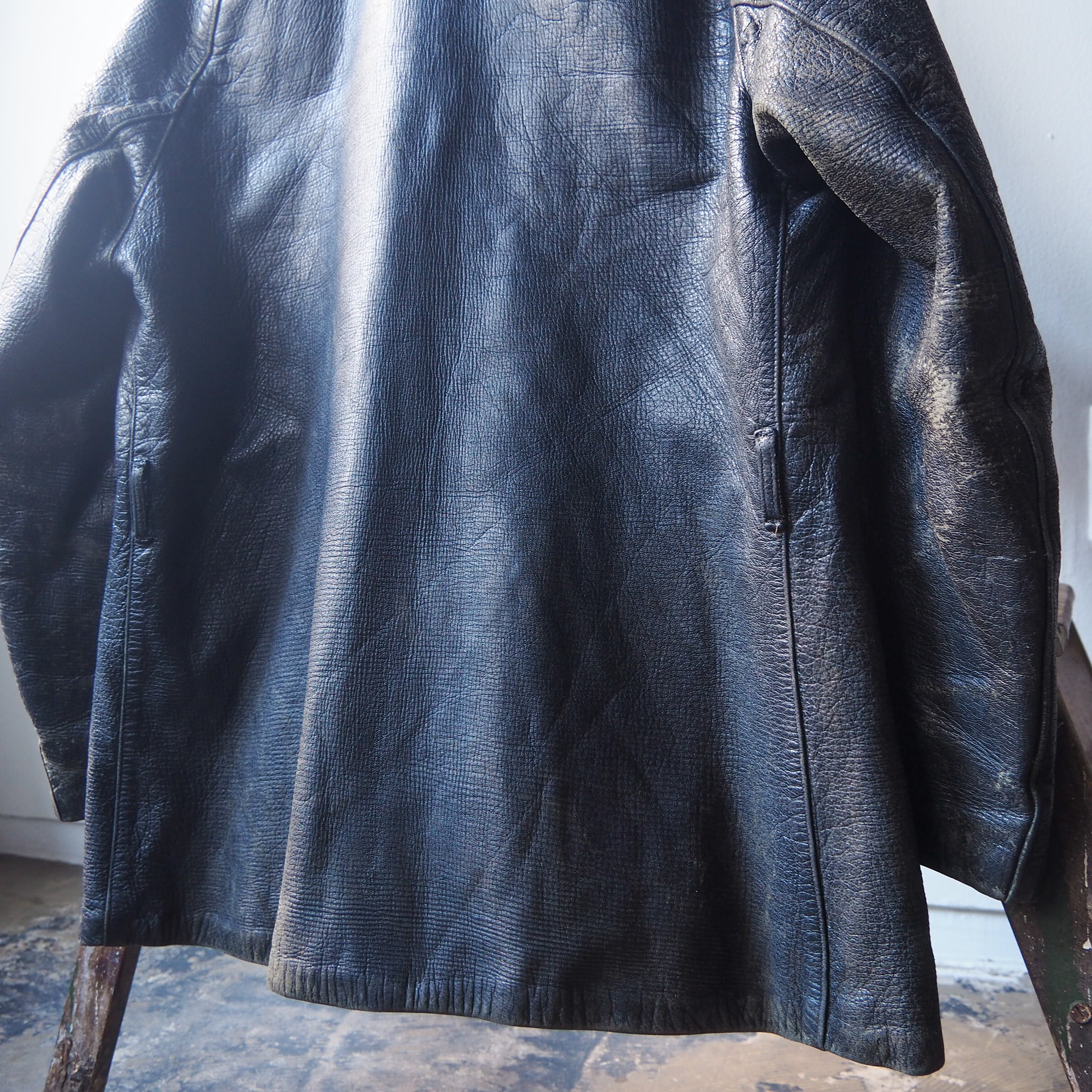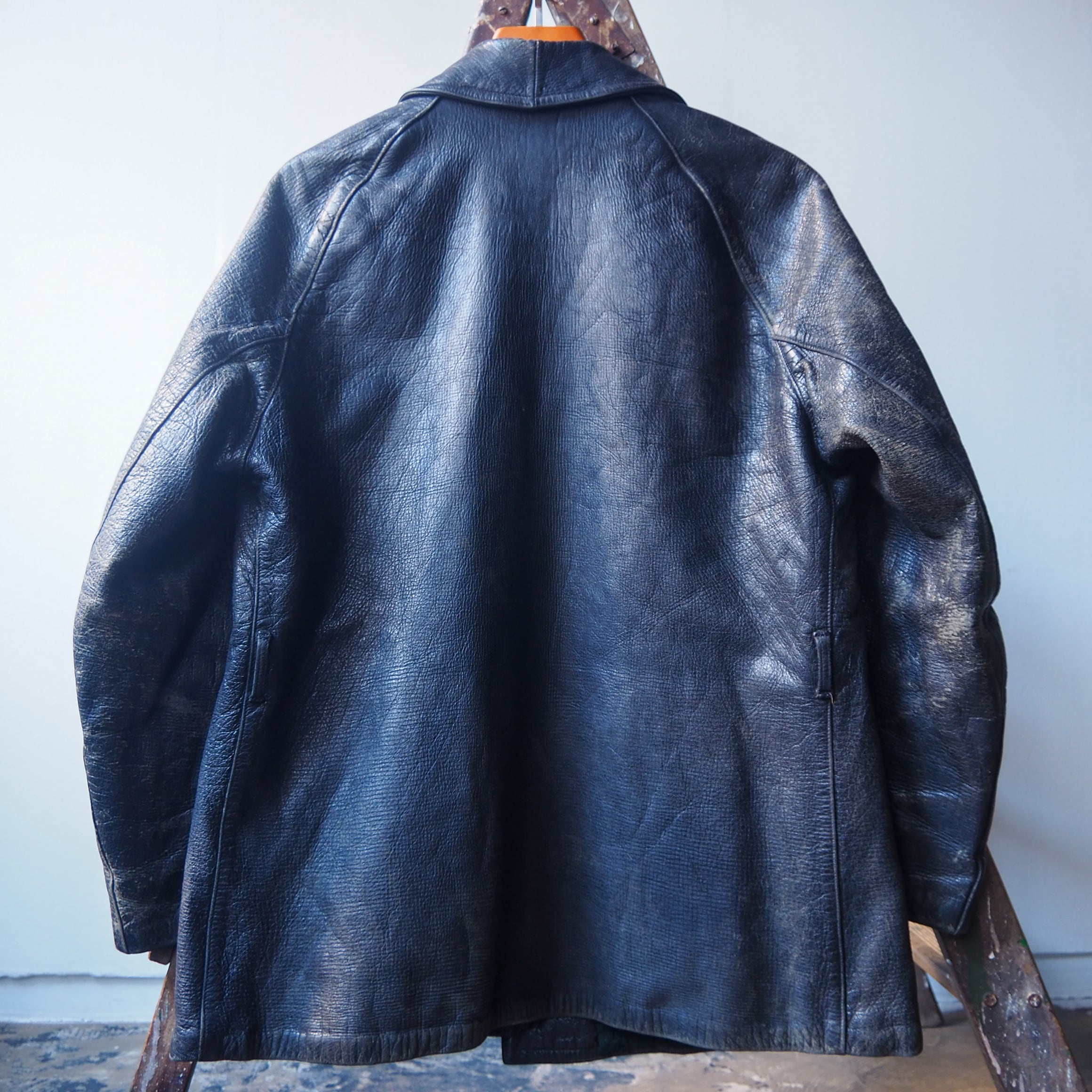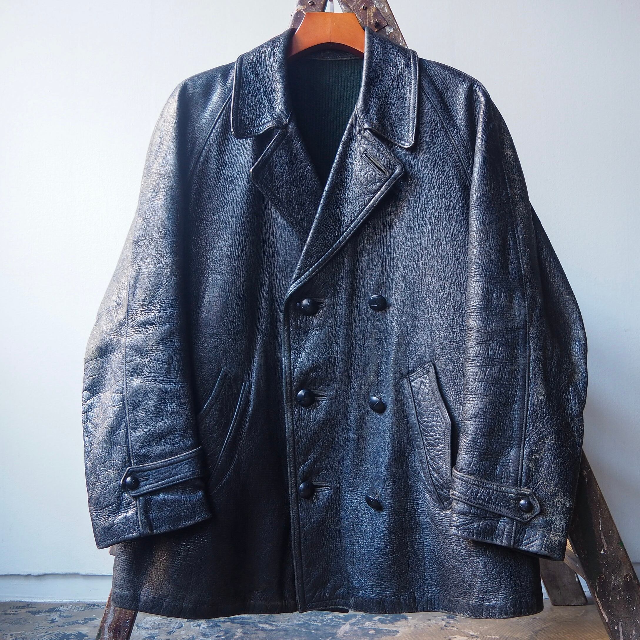 製造から70余年の歳月を経た現在でもなお鈍く鋭い光沢を発するキメの細かい上質なゴートスキン。形の良い襟が特徴的なパターンメイキング。機動力を損ねないラグラン仕様の肩周りなど、カーコートという用途に沿った上でのこだわり抜かれたディティールの数々が見られます。