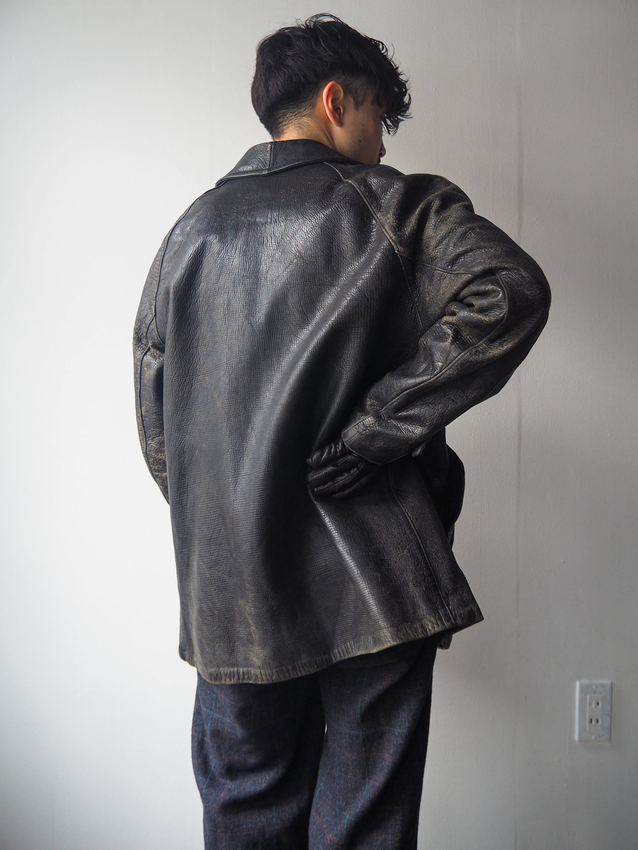 各所にヴィンテージレザー、特にゴートレザーに特有の銀面の剥がれがあり使い込まれクタッとソフトに変化した生地感も相まり大変雰囲気良くお召しいただけるかと思います。
